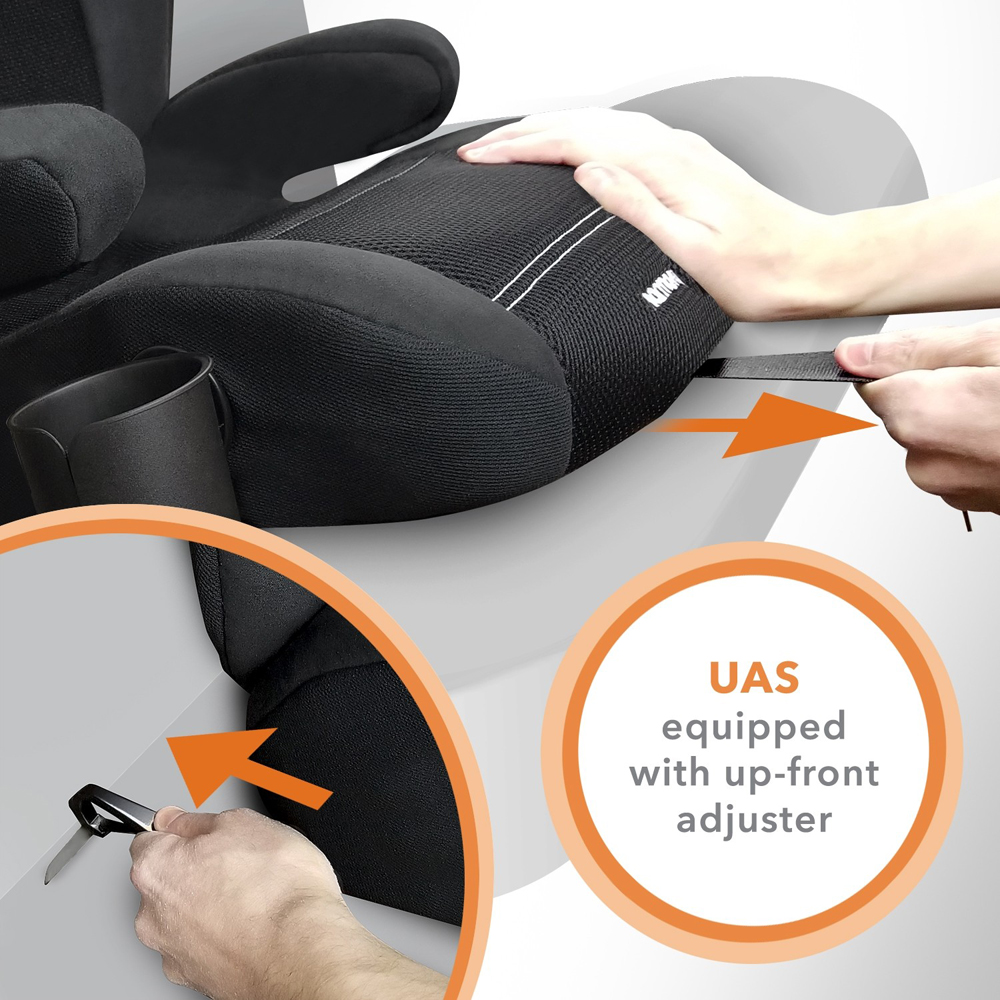- 1-hand, up-front adjustable UAS (Universal Anchorage System) secures the booster to the vehicle seat.
